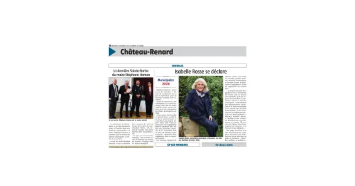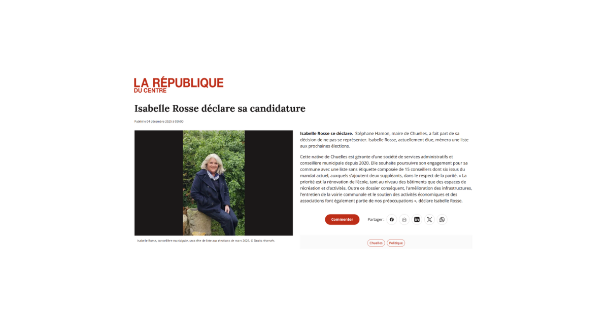 La candidature d’Isabelle Rosse pour les Municipales 2026 à Chuelles est à l’honneur dans La République du Centre . Découvrez son engagement, ses motivations et la vision qu’elle porte pour notre village.